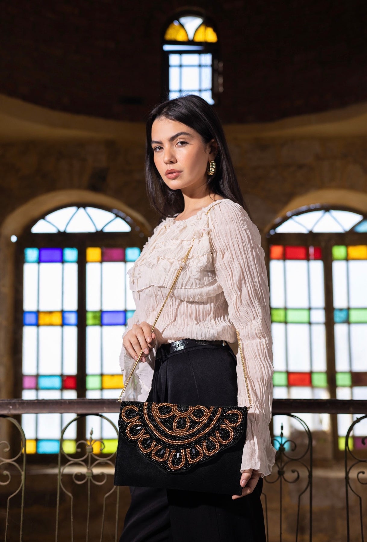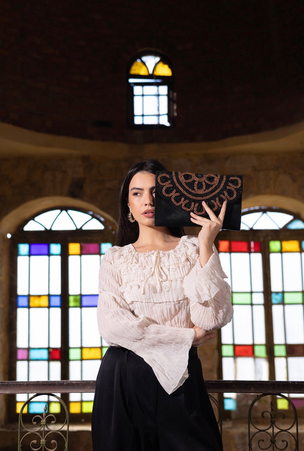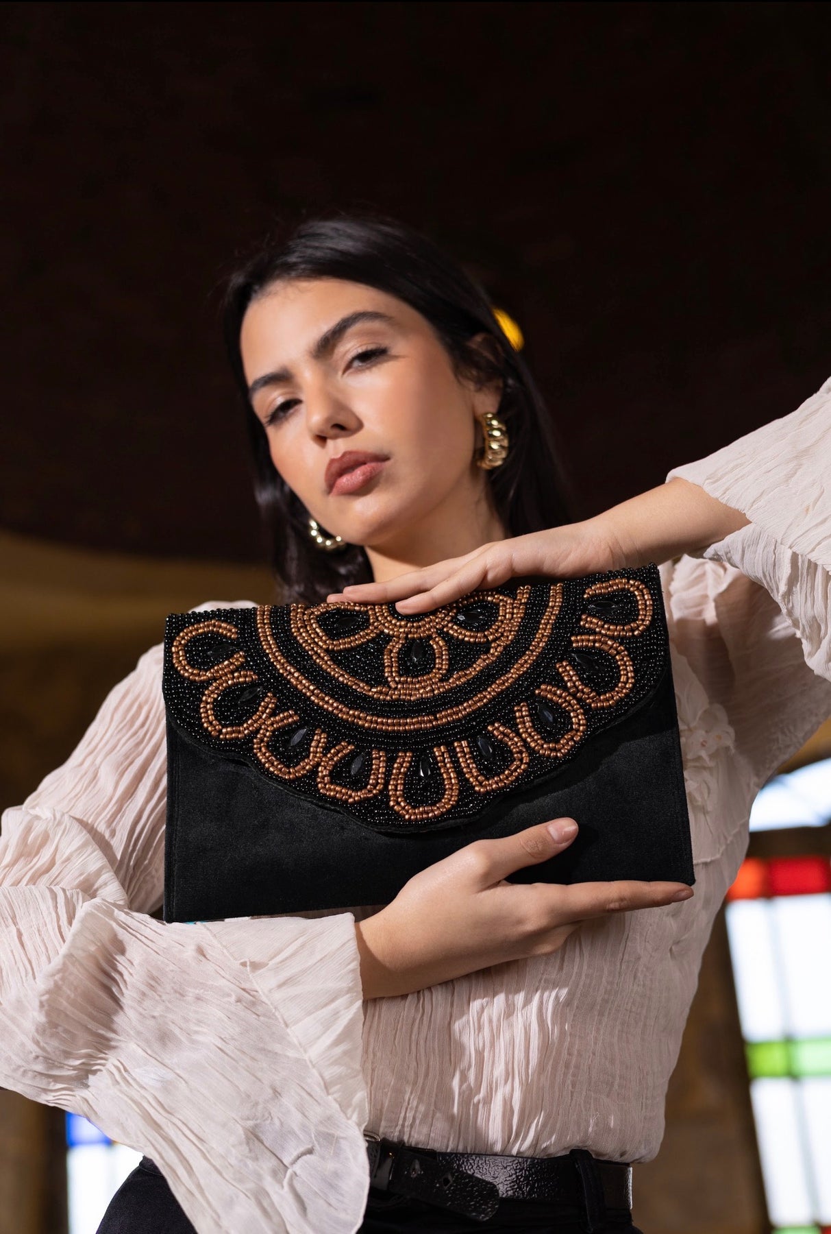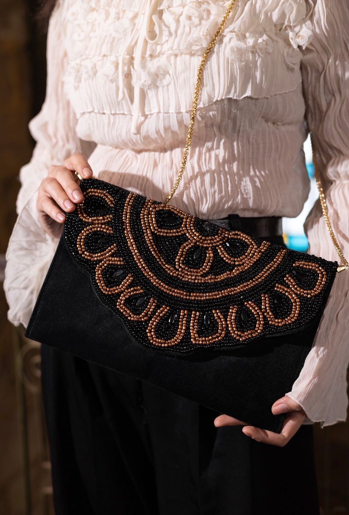 A black hand-embroidered clutch with bronze accents inspired by the sun. An elegant evening piece with a strong presence and refined artistic details.
