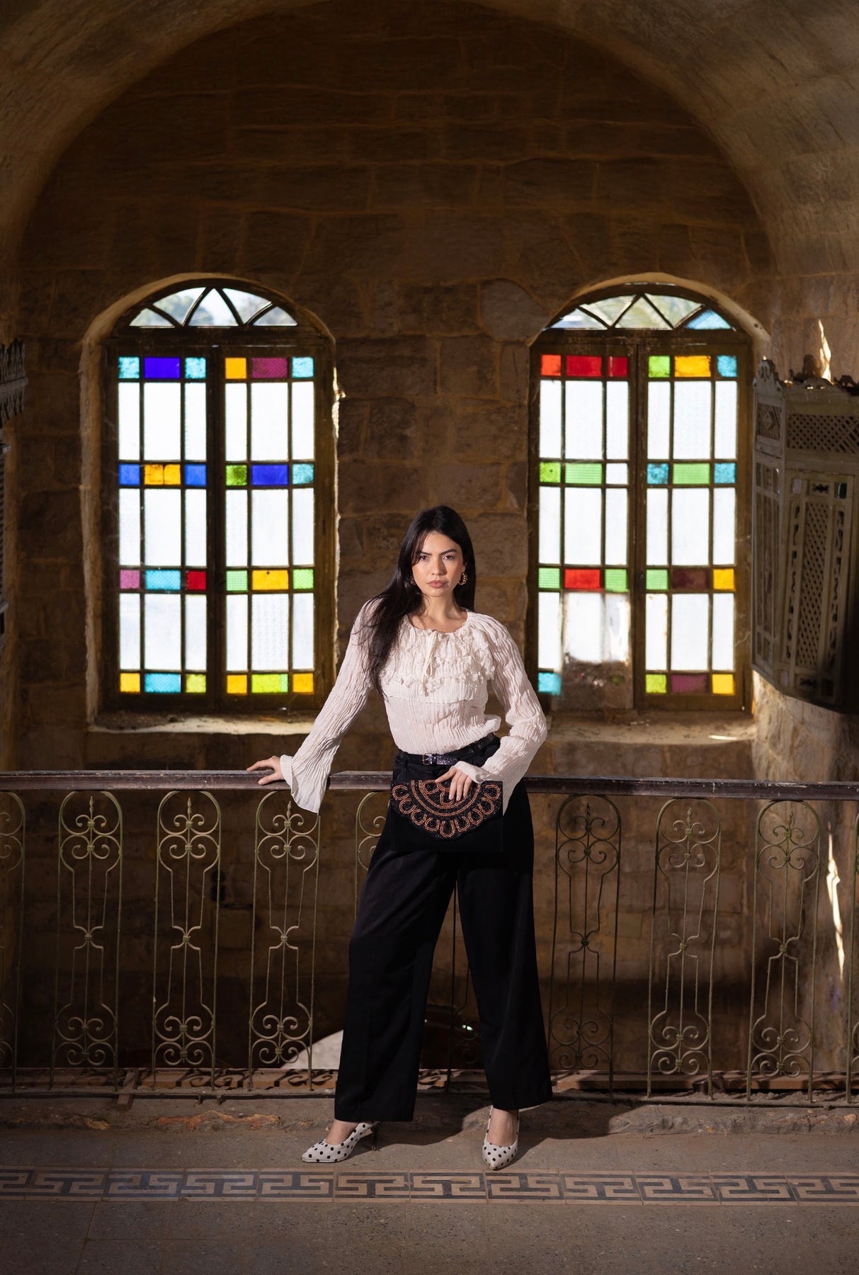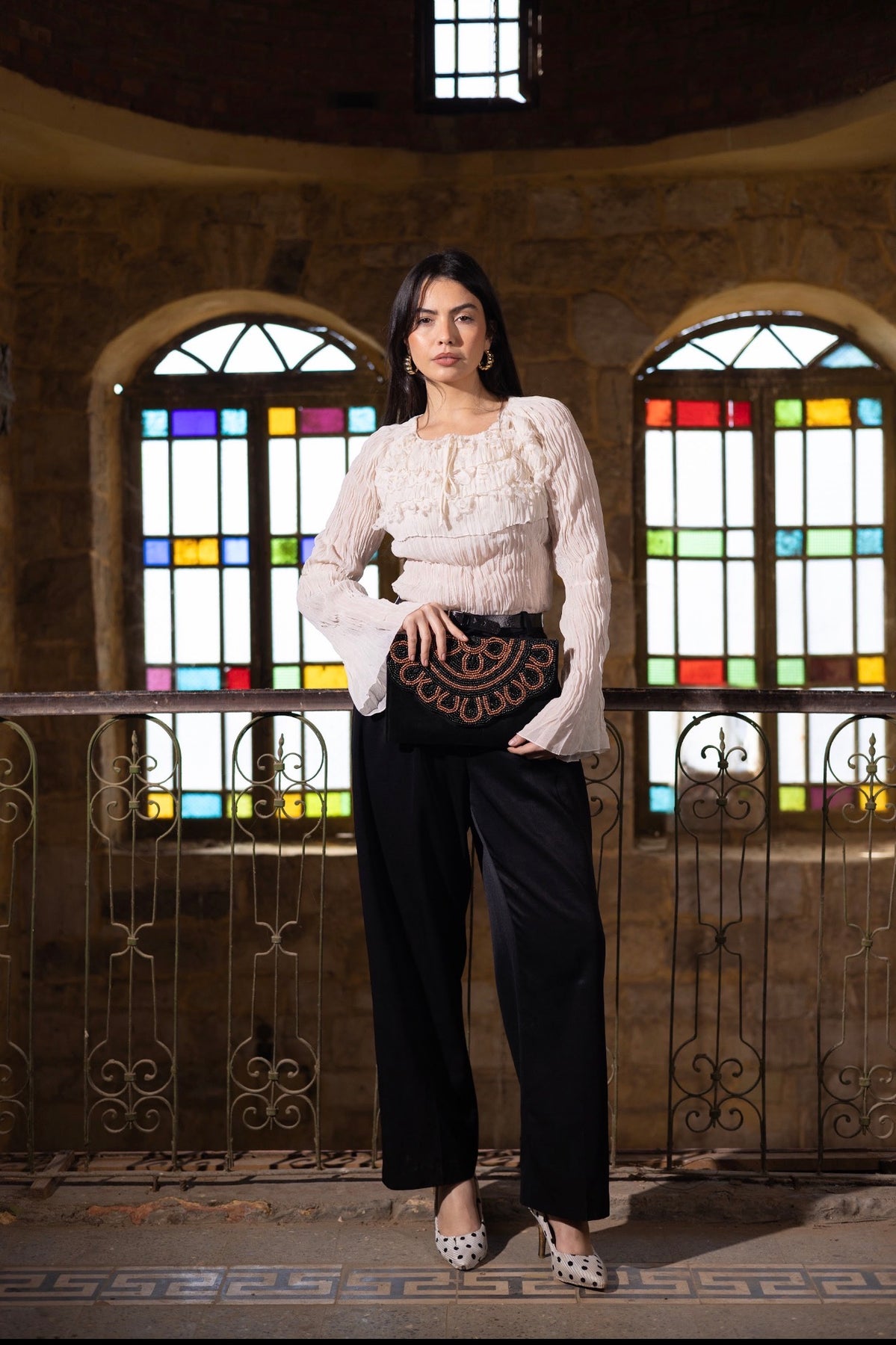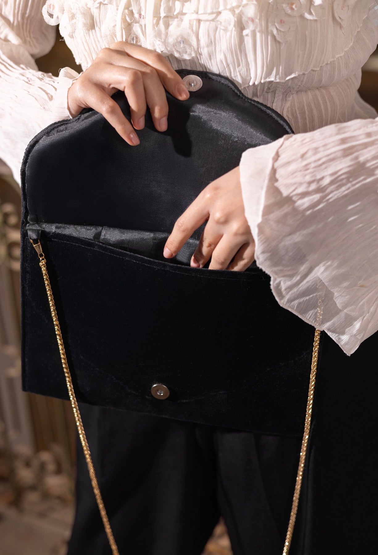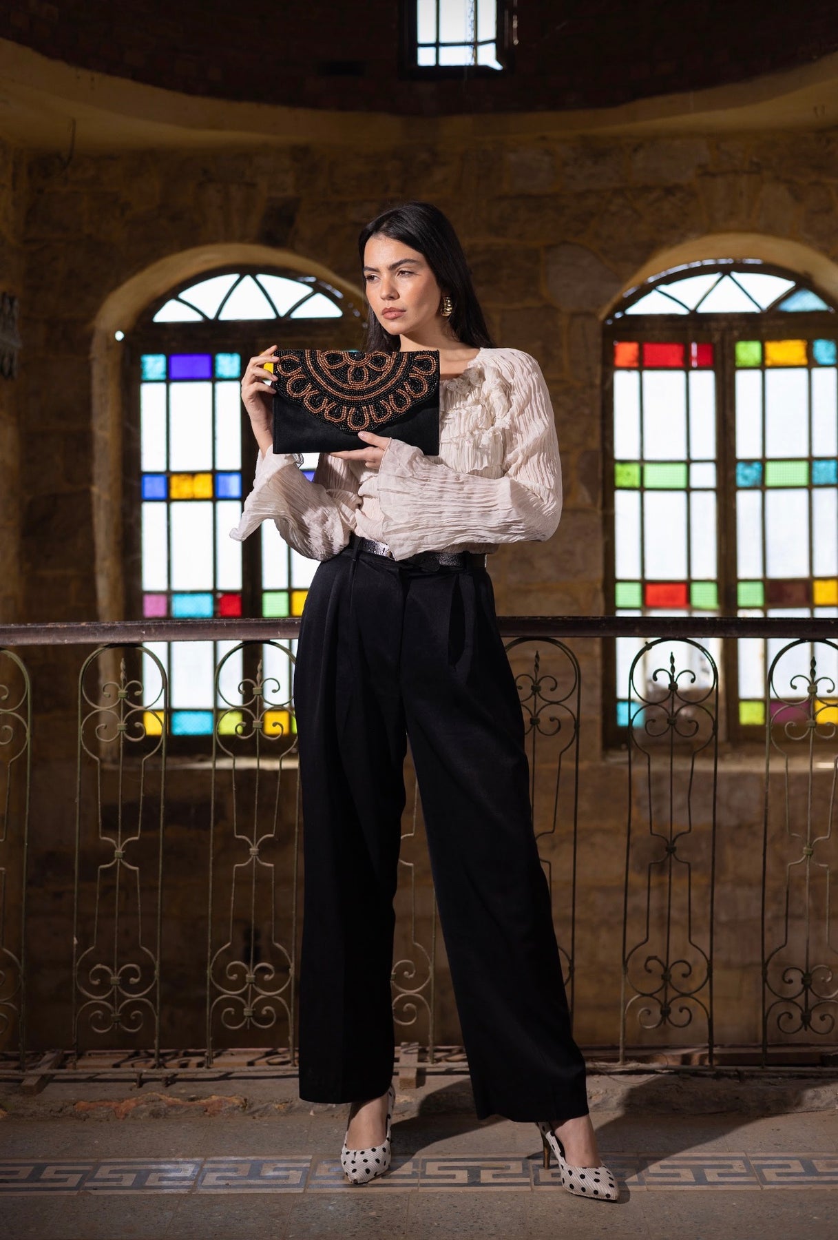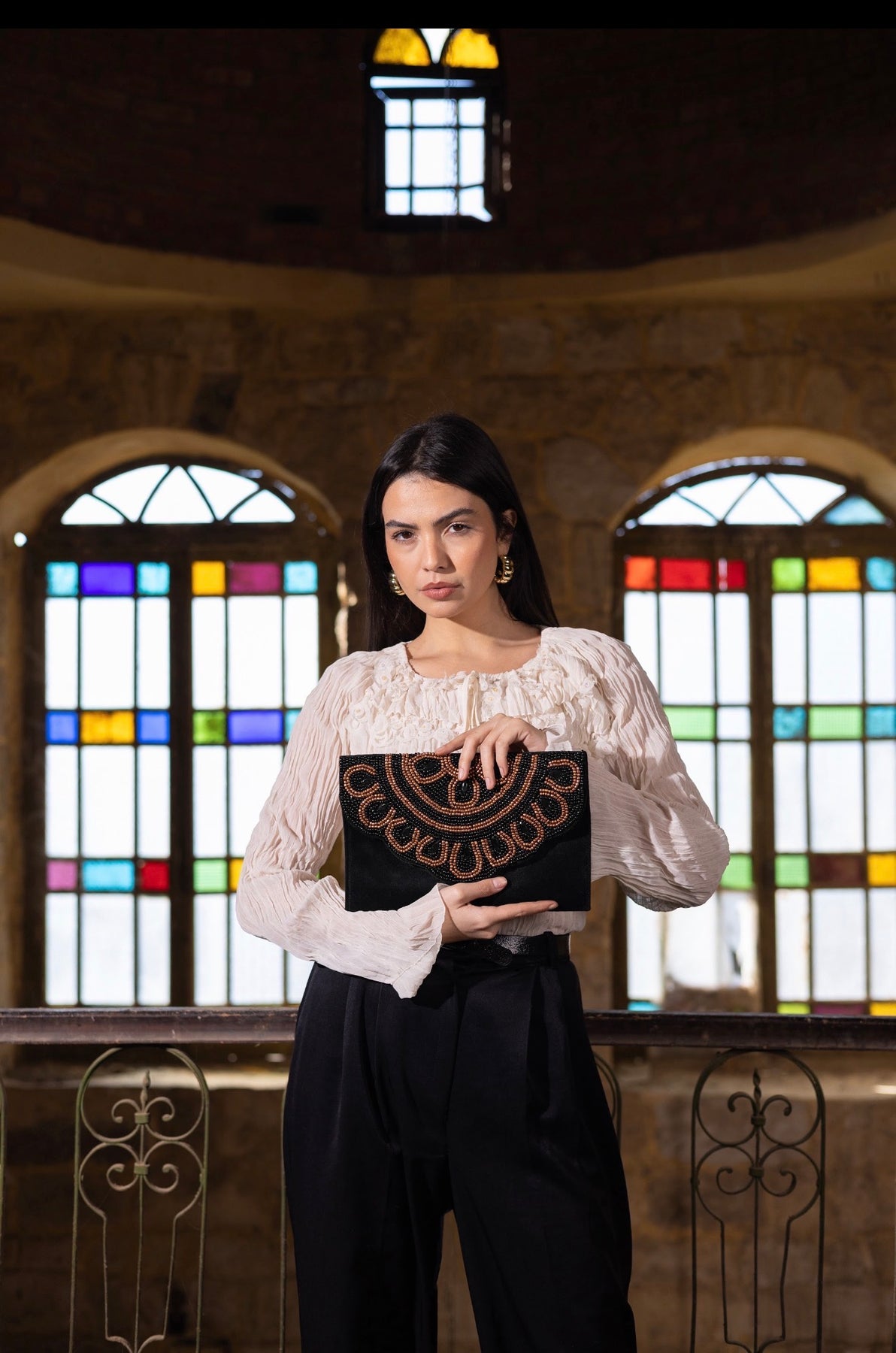 A black hand-embroidered clutch with bronze accents inspired by the sun. An elegant evening piece with a strong presence and refined artistic details.