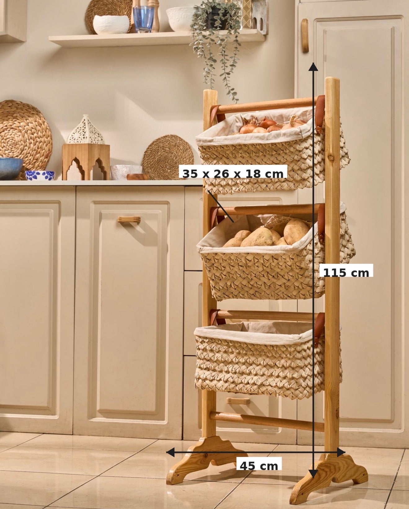 A beautifully crafted wooden storage trolley featuring three handwoven baskets designed to keep your kitchen organized while adding a warm natural touch to your space. The sturdy wooden frame combined with woven baskets creates a charming blend of functionality and rustic elegance. Perfect for storing fruits, vegetables, bread, or everyday kitchen essentials while keeping them easily accessible.