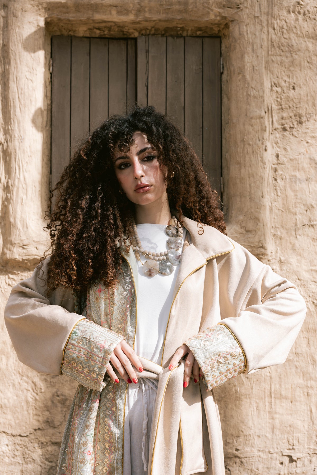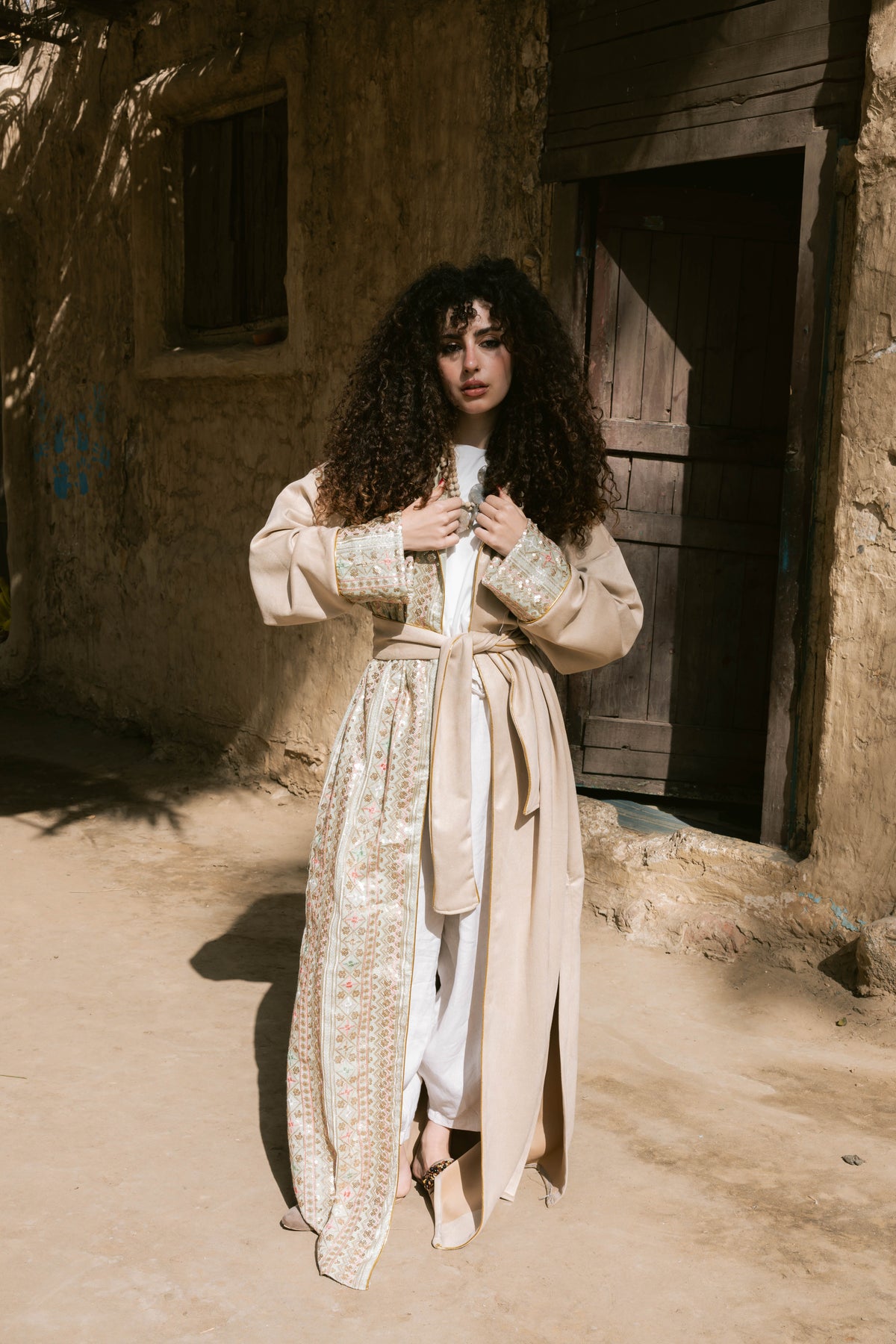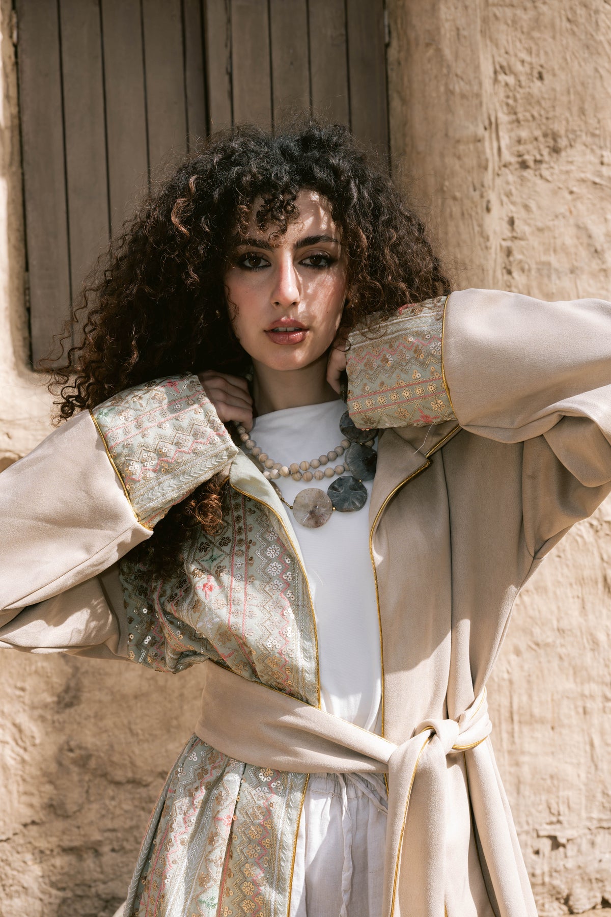 A soft cardigan crafted from Swedish velvet and embroidered Indian linen, featuring a refined waist belt that enhances the silhouette with effortless elegance.