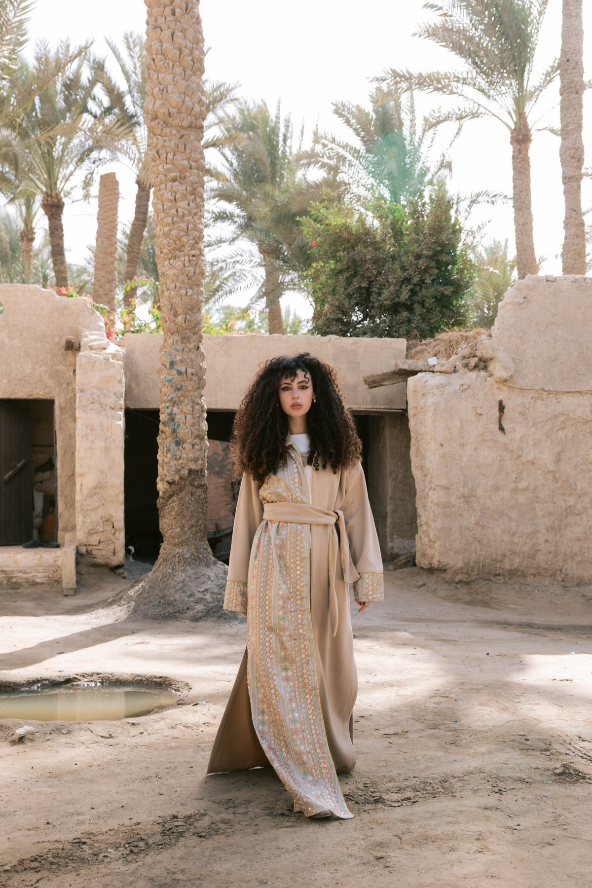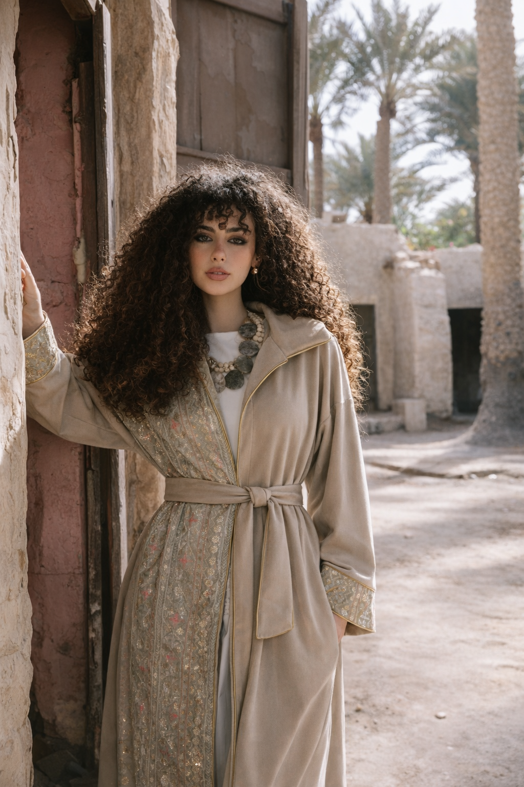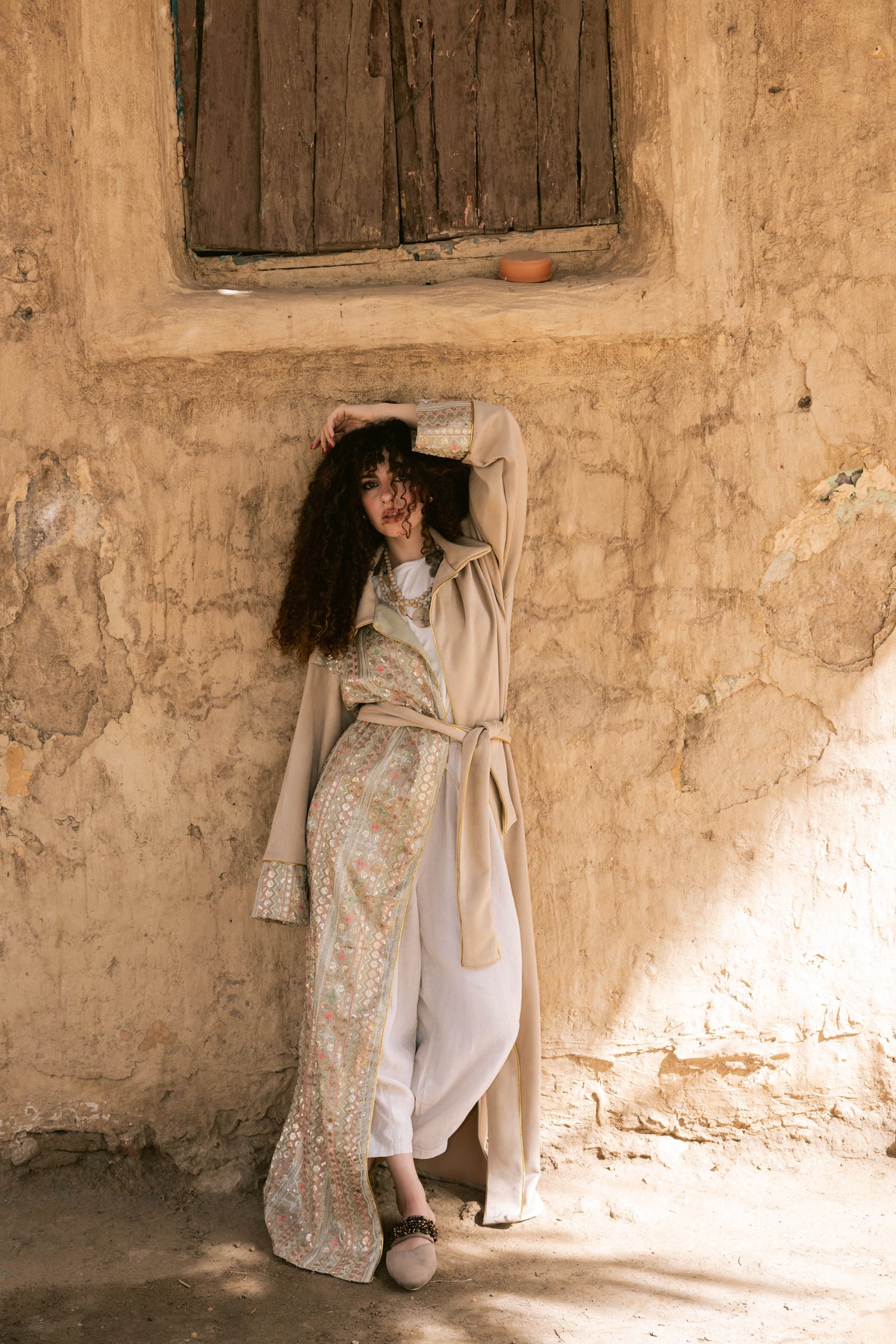 A soft cardigan crafted from Swedish velvet and embroidered Indian linen, featuring a refined waist belt that enhances the silhouette with effortless elegance.