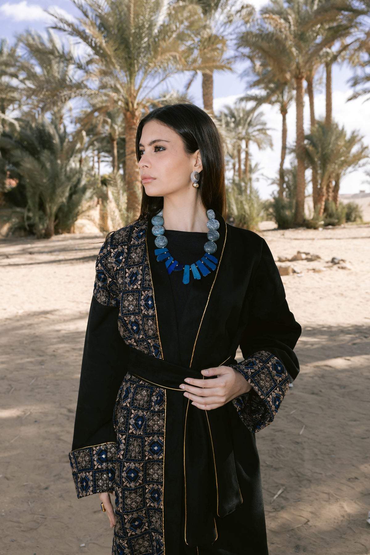 Crafted from soft Swedish velvet and embroidered linen, this statement jacket features geometric heritage patterns, refined sleeve detailing, and a cinched belt that brings structure and elegance to the silhouette.